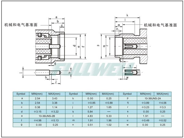 电器特性 阻抗 50Ω 运作频率范围 0 to 40 GHz 电压驻波比 ≤1.2 + .03f (GHz) 讯号泄漏 ≥60 dB 绝缘耐电压 750 V rms 电压额定值 ≥500 V rms (depending on cable) 内部导体电阻 ≤5 mΩ 外部导体阻抗 ≤2.5 mΩ